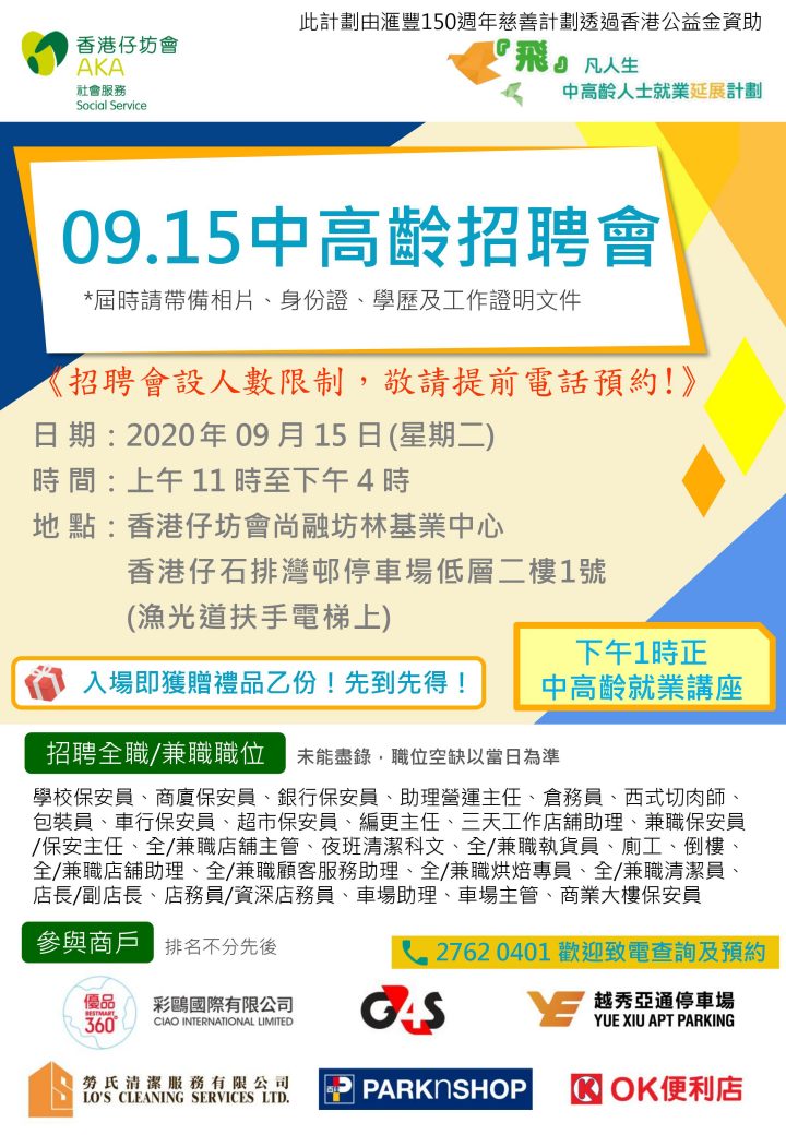 18 5 月, 2020 職位無限「耆」– 中高齡人士職位空缺創作比賽(經已截止,感謝支持!) 參賽準則 比賽目的 鼓勵中高齡人士發展所長,投入就業市場 推動社會為中高齡人士發掘就業市場上的新型工作機會 向 [...] Tong Wing Yiu 1699