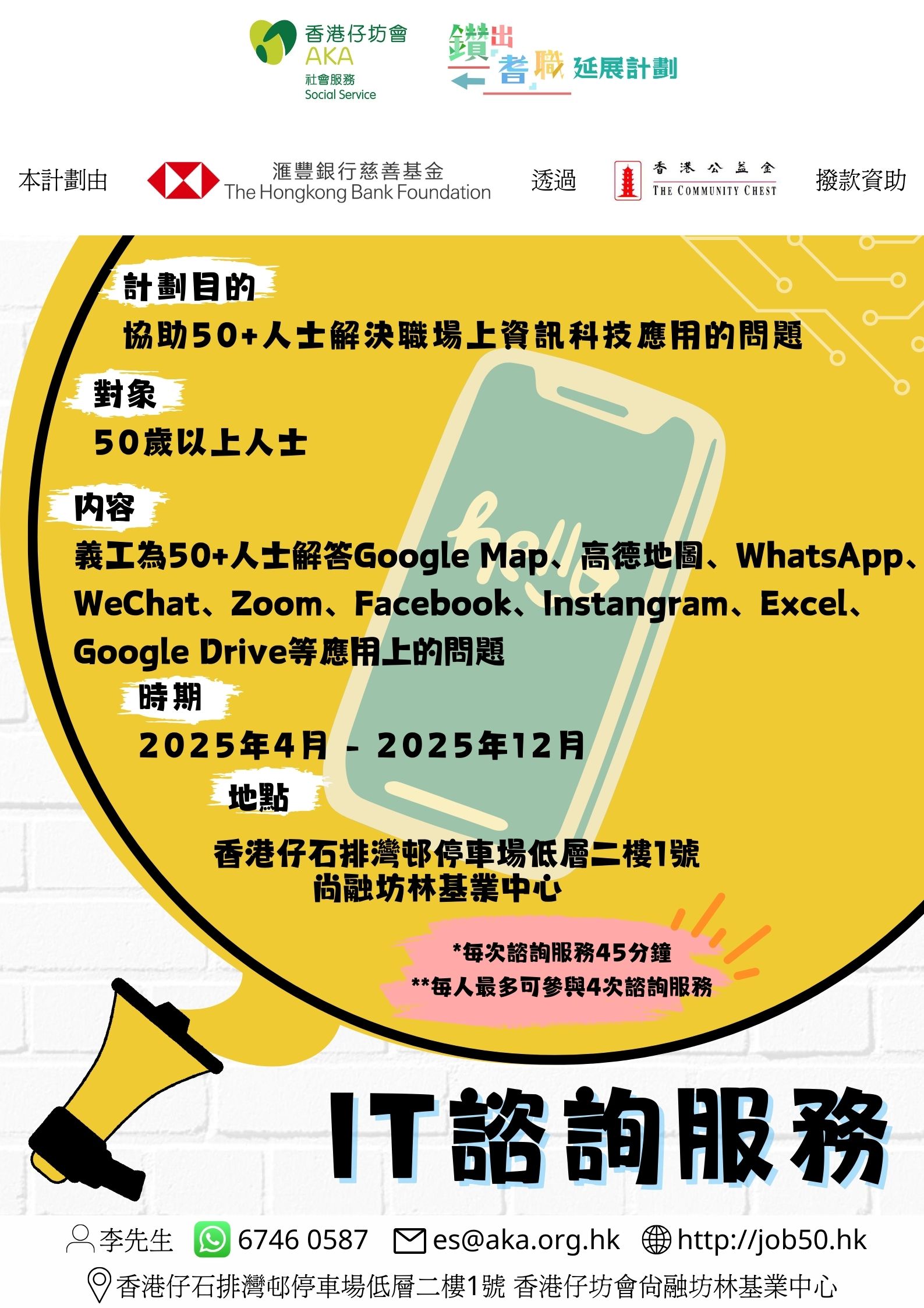 計劃目的 協助50+人士解決職場上資訊科技應用的問題 對象 50歲以上人士 内容 義工為50+人士解答Goog […]