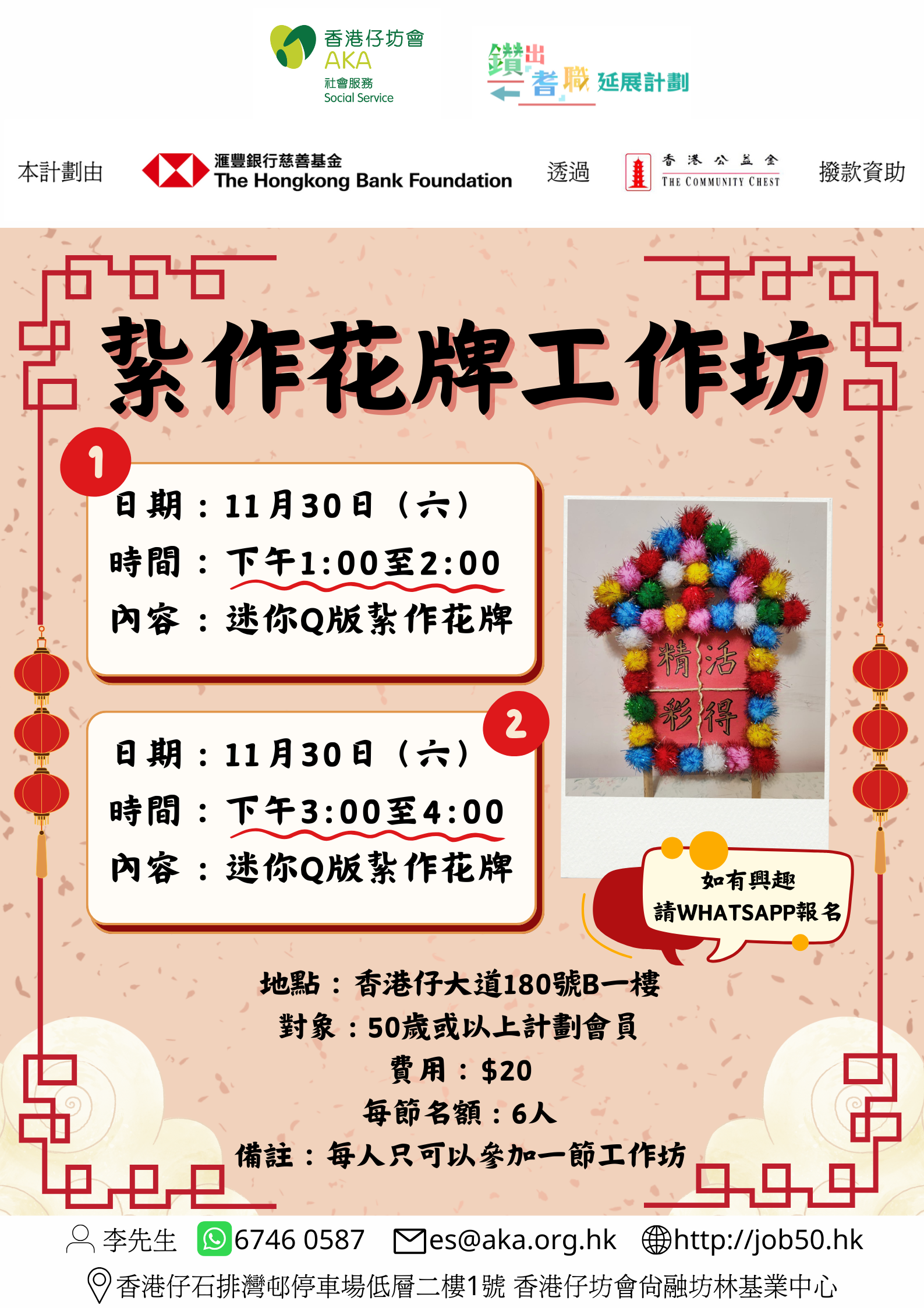 紥作花牌工作坊 日期 : 11月30日(六) 內容 : 迷你Q版紥作花牌 地點:香港仔大道180 […]