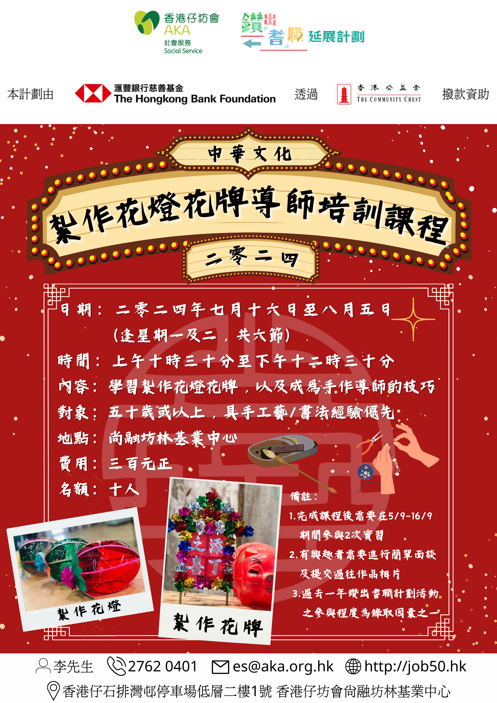 30 9 月, 2024 鑽出耆職手作市集 – 檔主招募 鑽出耆職延展計劃首個50+手作市集,將在11月30日(星期六)於香港仔坊會總部禮堂舉行。現正誠邀各位50+手作 […] aka_admin 106